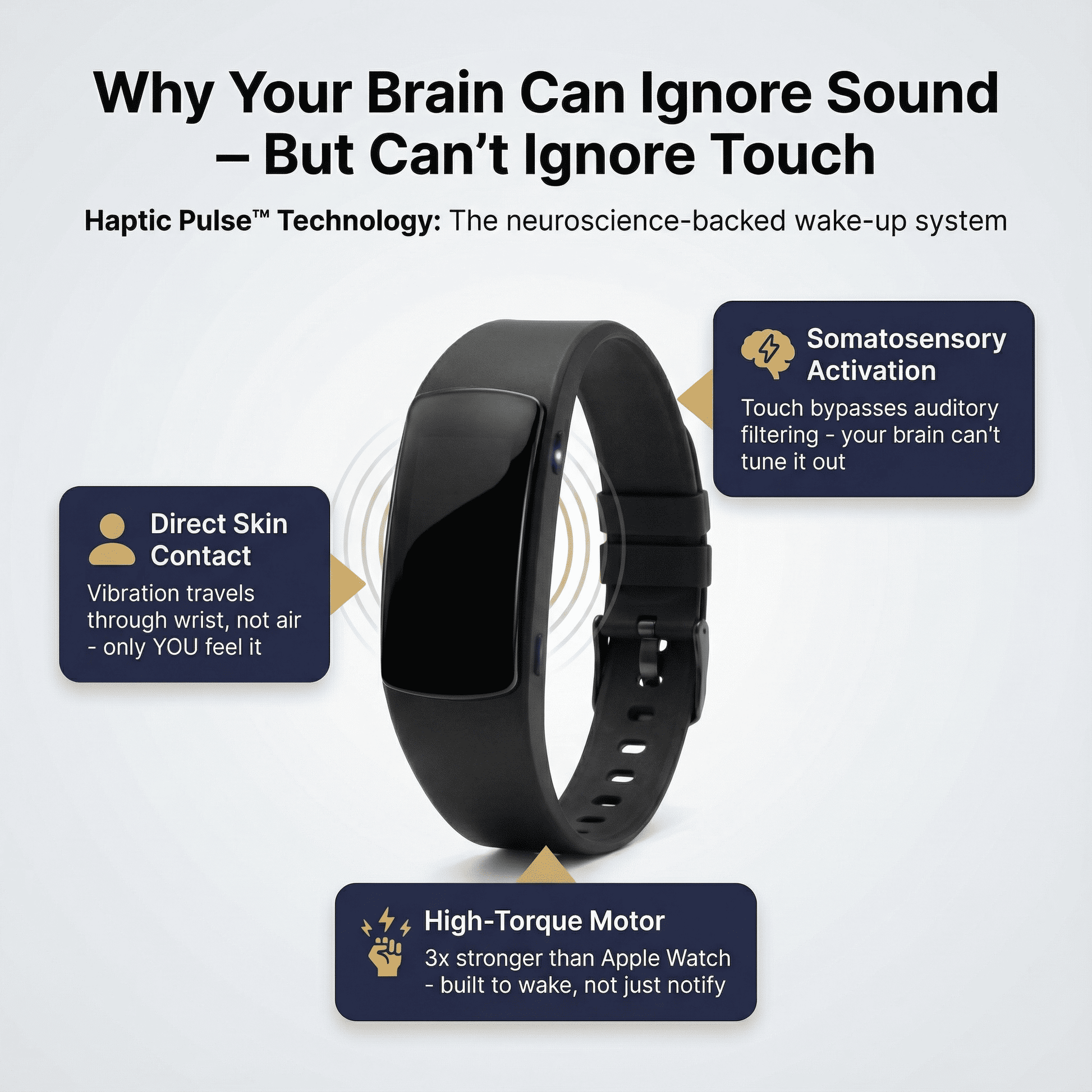 "Sound is a grenade. Touch is a sniper. WakeBand puts the wakeup call exactly where it belongs—on you."